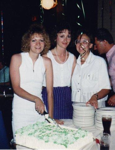 - Cake Cutting Karen, Fran and Lori cutting the cake.